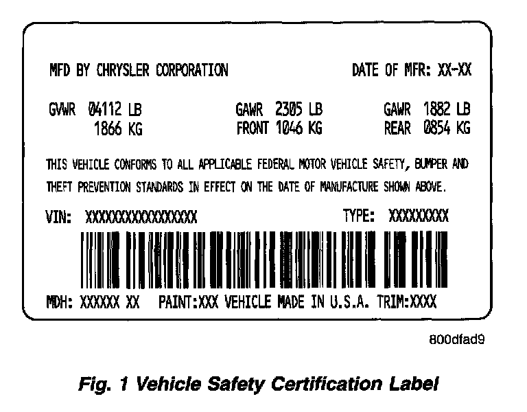 A vehicle safety certification label is attached to the left side of B-pillar or on the rearward facing of the front door (Fig. 1). This label indicates date of manufacture (month and year), Gross Vehicle Weight Rating (GVWR), Gross Axle Weight Rating (GAWR) front, Gross Axle Weight Rating (GAWR) rear and the Vehicle Identification Number (VIN). The Month, Day and Hour of manufacture is also included.