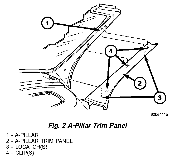 2. Disengage clips attaching A-pillar trim to A-pillar (Fig. 1).