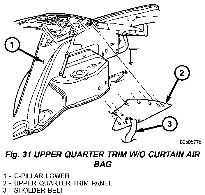 6. Disengage clips attaching upper quarter trim to inner quarter panel (Fig. 30) and (Fig. 31).