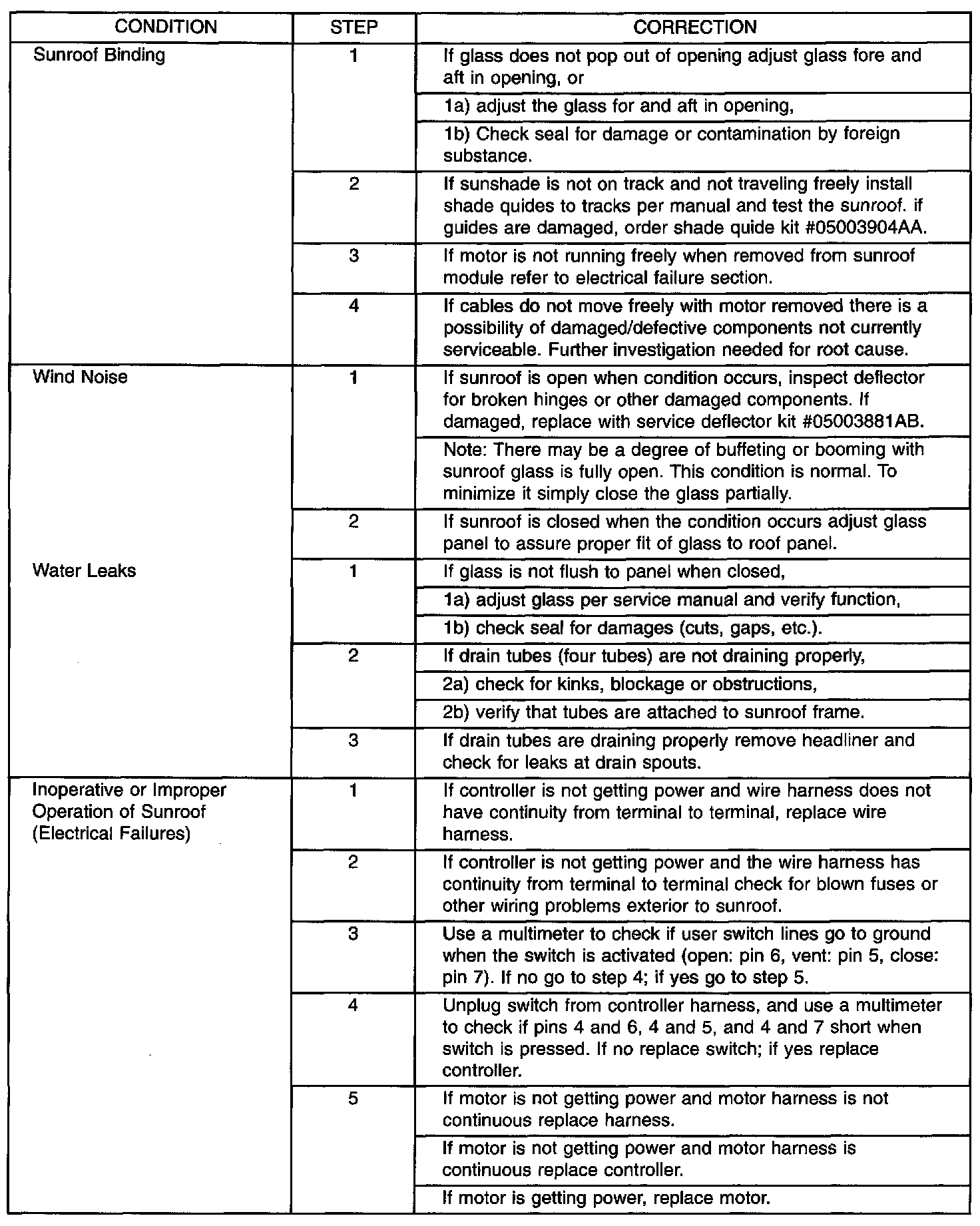 DIAGNOSIS AND TESTING - SUNROOFBefore beginning sunroof diagnostics verify that all other power accessories are in proper operating condition. Refer to Sunroof Diagnostic Chart for possible causes. If not, a common electrical problem may exist. Check the condition of the circuit protection (20 amp circuit breaker in cavity 19 of the Junction Block). Inspect all wiring connector pins for proper engagement and continuity. Check for battery voltage at the power sunroof controller, for circuit information. If battery voltage of more than 10 volts is detected at the controller, proceed with the following tests (the controller will not operate at less than 10 volts).