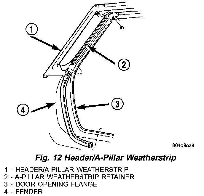 6. Remove nuts holding header and A-pillar weatherstrip at upper corners of windshield (Fig. 12).