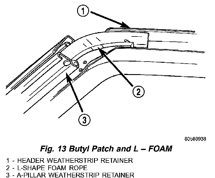 CAUTION: Ensure that the butyl patch and butyl rope at each corner of the windshield is present and in good condition (Fig. 13). The butyl is critical for the water management system. Replace as necessary.