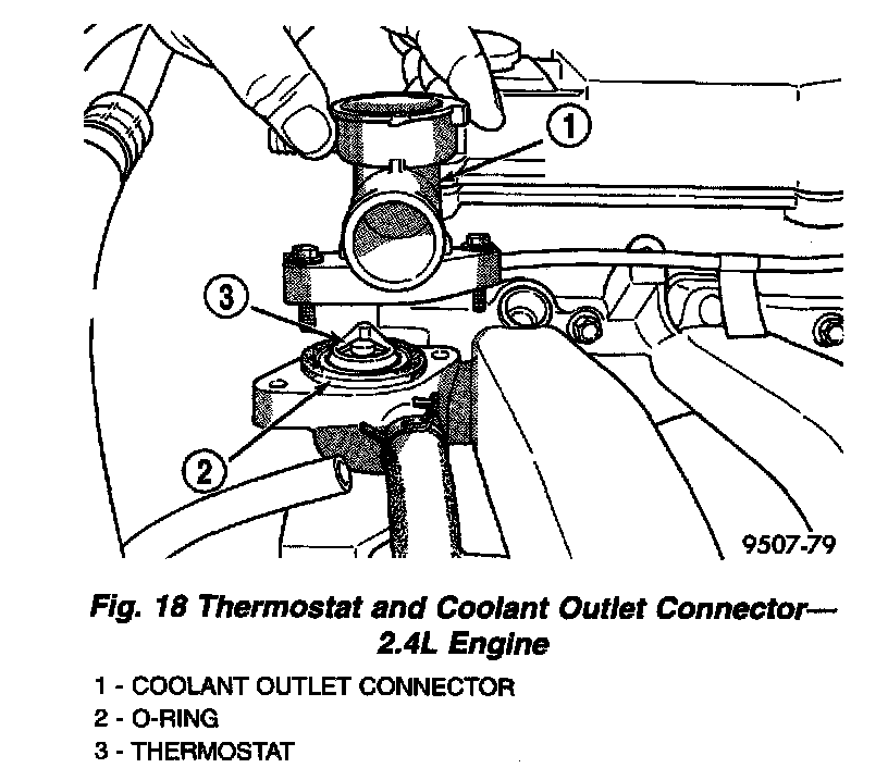 DESCRIPTIONThe 2.4L engine thermostat is located on the front of the engine (radiator side) in the thermostat housing/coolant outlet connector. The thermostat has a air bleed vent located in the flange and an O-ring with a locating dimple incorporated on it. There is a relief in the housing for positioning the air bleed.