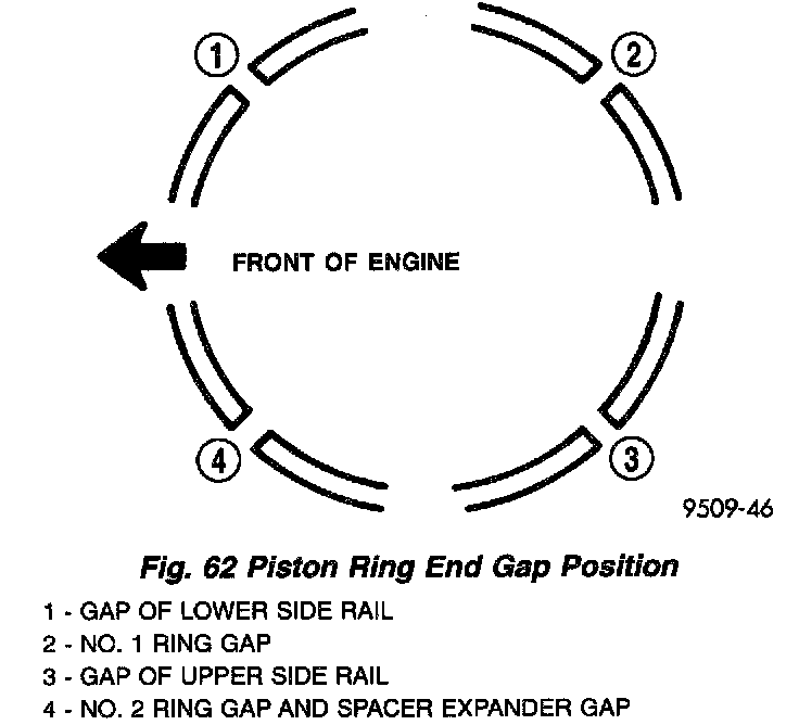 2. Before installing the ring compressor, make sure the oil ring expander ends are butted and the rail gaps located as shown in (Fig. 62). As viewed from top.