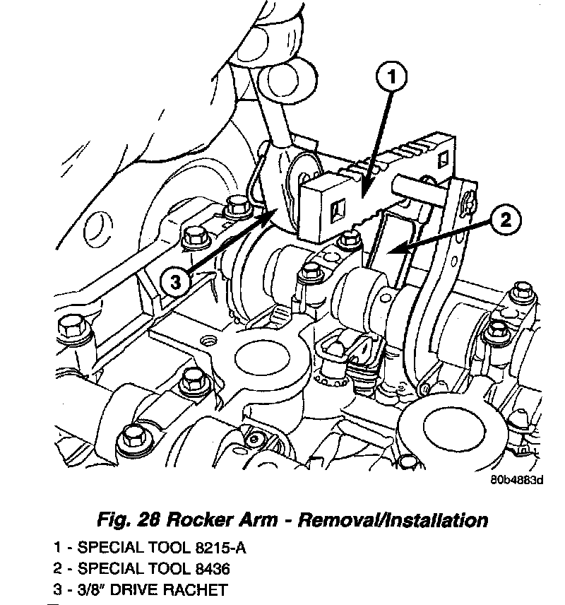 2. Using Special Tools 8215-A and 8436 slowly depress valve assembly until rocker arm can be installed on the hydraulic lifter and valve stem (Fig. 28).