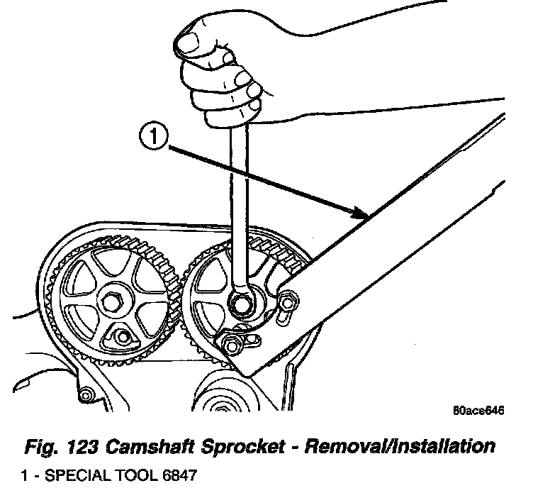 3. Hold camshaft sprocket with Special Tool 6847 while removing bolt (Fig. 123). Remove both cam sprockets.