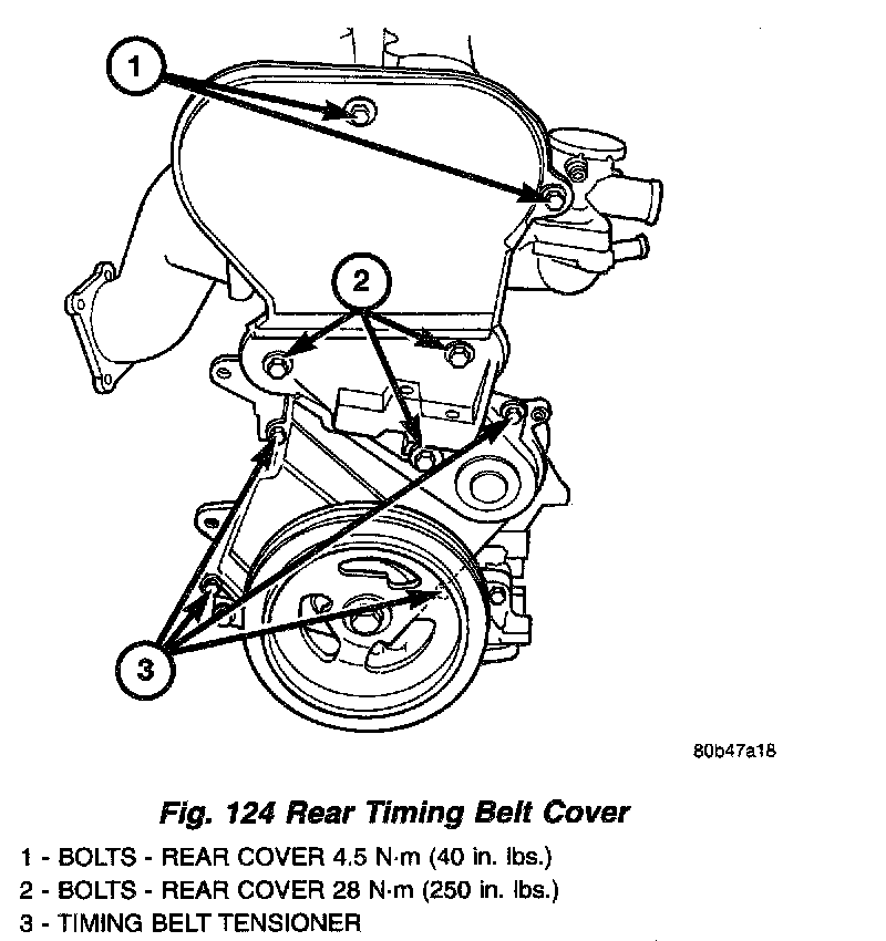 4. Remove rear timing belt cover fasteners and remove cover from engine (Fig. 124).