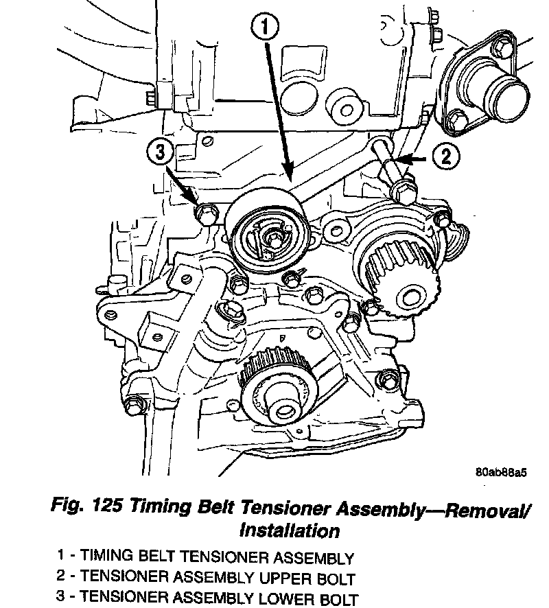 1. Align timing belt tensioner assembly to engine and install lower mounting bolt but do not tighten (Fig. 125). To properly align tensioner assembly-install one of the engine bracket mounting bolts (M10) 5 to 7 turns into the tensioner's upper mounting location (Fig. 125).