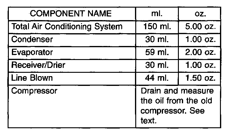 When an air conditioning system is first assembled, all components (except the compressor) are refrigerant oil free. After the system has been charged with (R-134a) refrigerant and operated, the oil in the compressor is dispersed through the lines and components. The evaporator, condenser and receiver/drier will retain a significant amount of oil. Refer to the A/C Component Refrigerant Oil Capacities table. When a component is replaced, the specified amount of refrigerant oil must be added. When the compressor is replaced, the amount of oil that is retained in the rest of the system must be drained from the replacement compressor. When a line or component has ruptured and oil has escaped, the compressor should be removed and drained. The receiver/drier must be replaced along with the ruptured part. The oil capacity of the system, minus the amount of oil still in the remaining components, can be measured and poured into the suction port of the compressor.