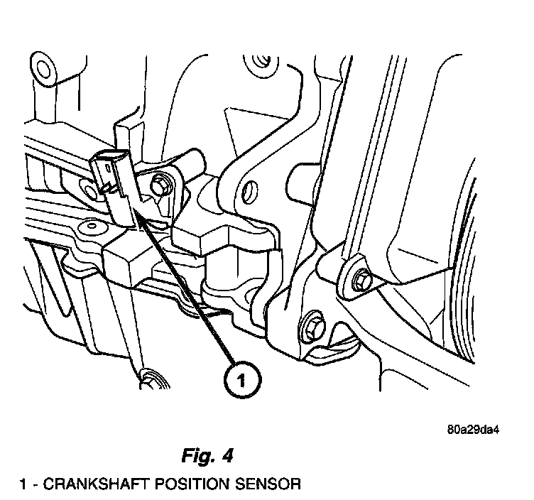 This crankshaft sensor is located on the rear of the engine near the accessory drive belt. The bottom of the sensor is positioned next to the drive plate.