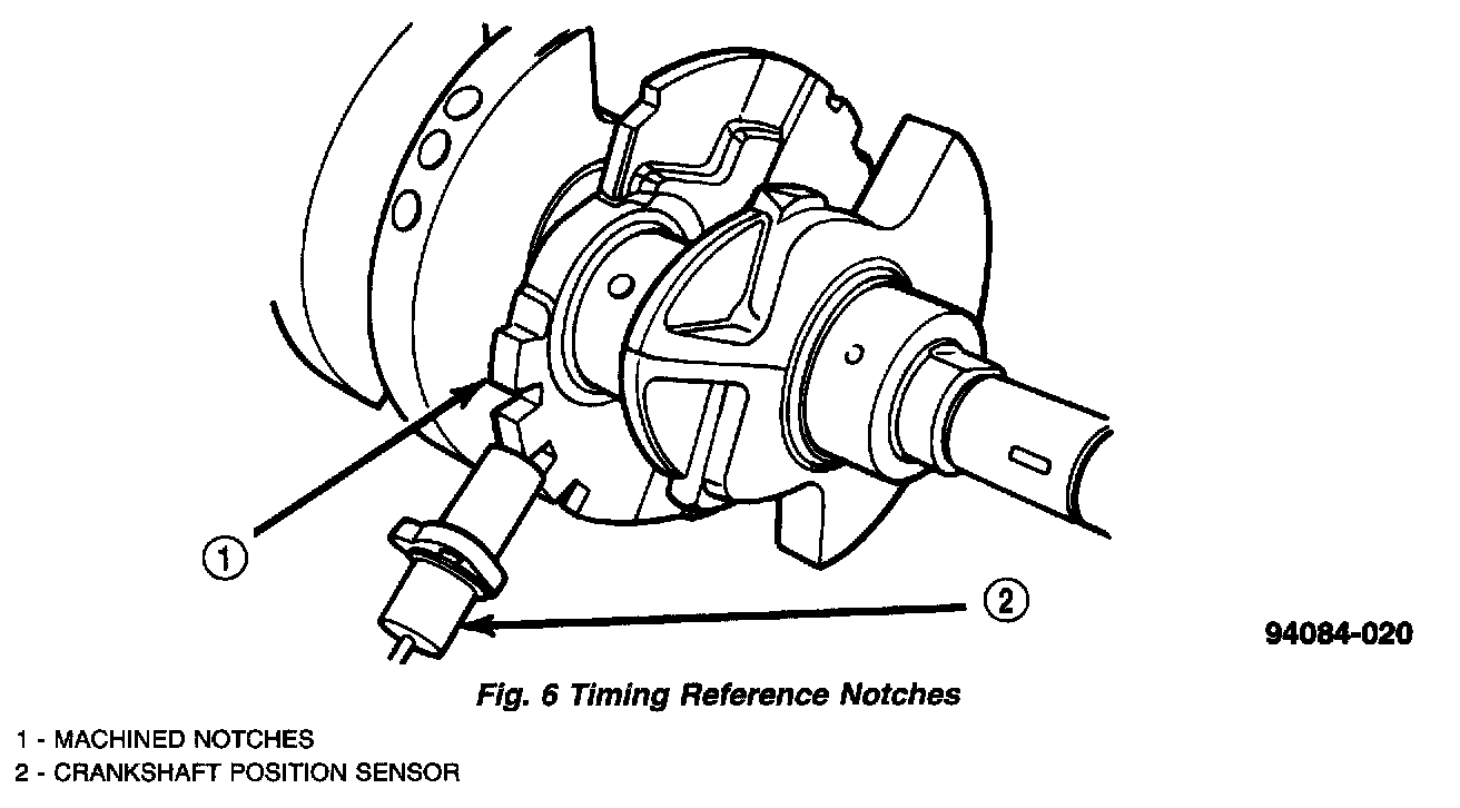 The timing reference notches are machined at 20° increments. From the voltage pulse width the PCM tells the difference between the timing reference notches and the 60 degree signature notch. The 60 degree signature notch produces a longer pulse width than the smaller timing reference notches. If the camshaft position sensor input switches from high to low when the 60 degree signature notch passes under the crankshaft position sensor, the PCM knows cylinder number one is the next cylinder at TDC. The crankshaft position sensor notifies the PCM that 2 cylinders are on Top Dead Center. Based on this, the PCM will energize one of these 2 cylinder's injectors and ignition coil. The camshaft position sensor identifies which cylinder of the 2 is on Top Dead Center and on the compression stroke.