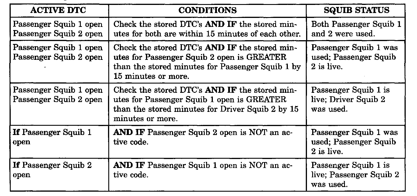 CAUTION: DEPLOYED FRONT AIRBAGS MAY OR MAY NOT HAVE LIVE PYROTECHNIC MATERIAL WITHIN THE AIR BAG INFLATOR. DO NOT DISPOSE OF 2001 MODEL YEAR DRIVER AND PASSENGER AIRBAGS UNLESS YOU ARE SURE OF COMPLETE DEPLOYMENT. PLEASE REFER TO THE HAZARDOUS SUBSTANCE CONTROL SYSTEM FOR PROPER DISPOSAL. DISPOSE OF DEPLOYED AIRBAGS IN A MANNER CONSISTENT WITH STATE, PROVINCIAL, LOCAL, AND FEDERAL REGULATIONS. USE THE FOLLOWING TABLE TO IDENTIFY THE STATUS OF THE AIRBAG SQUIB.