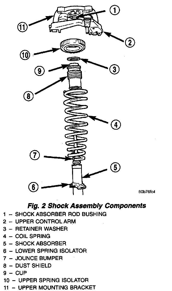 For the disassembly and assembly of the shock assembly, use strut spring compressor Pentastar Service Equipment (PSE) tool W-7200, or the equivalent, to compress the coil spring. Follow the manufacturer's instructions closely.