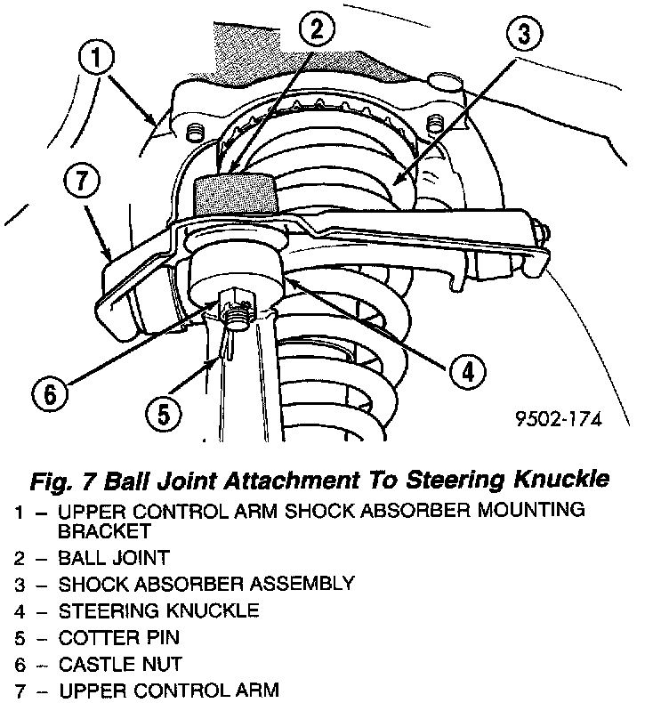 5. Install upper ball joint into steering knuckle. Install castle nut on ball joint stud. Tighten castle nut to a torque of 54 Nm (40 ft. lbs.). Install cotter pin in stud of ball joint.