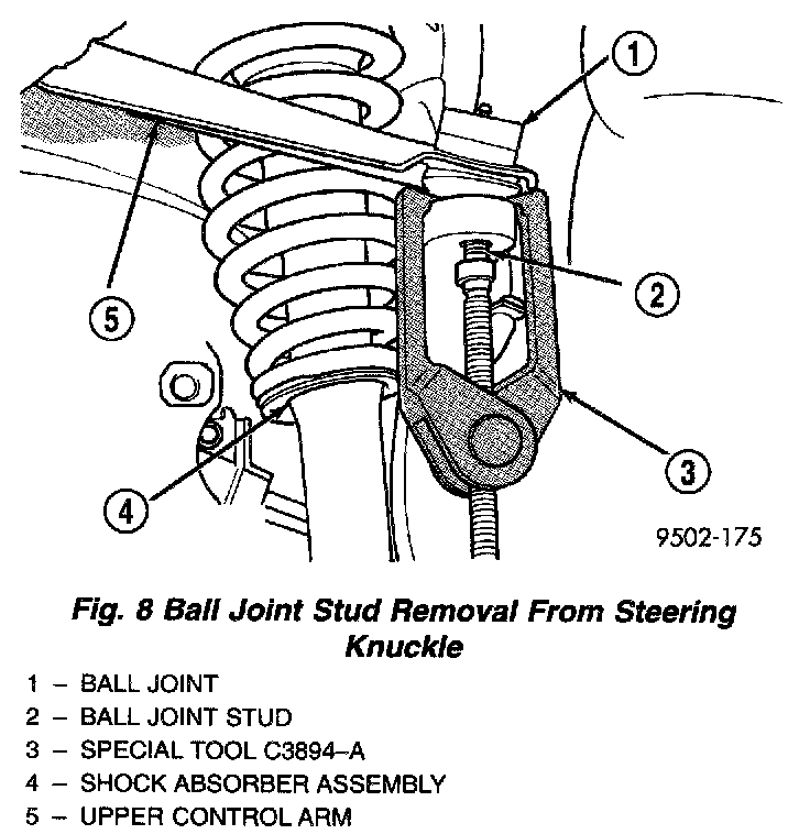 7. Remove the upper ball joint stud from the steering knuckle using Puller, Special Tool, C-3894-A. Pull steering knuckle outward and position toward the rear of the front wheel opening.