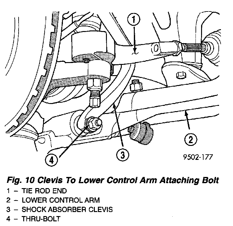 9. Remove the nut and thru-bolt attaching the shock absorber clevis to the lower control arm.