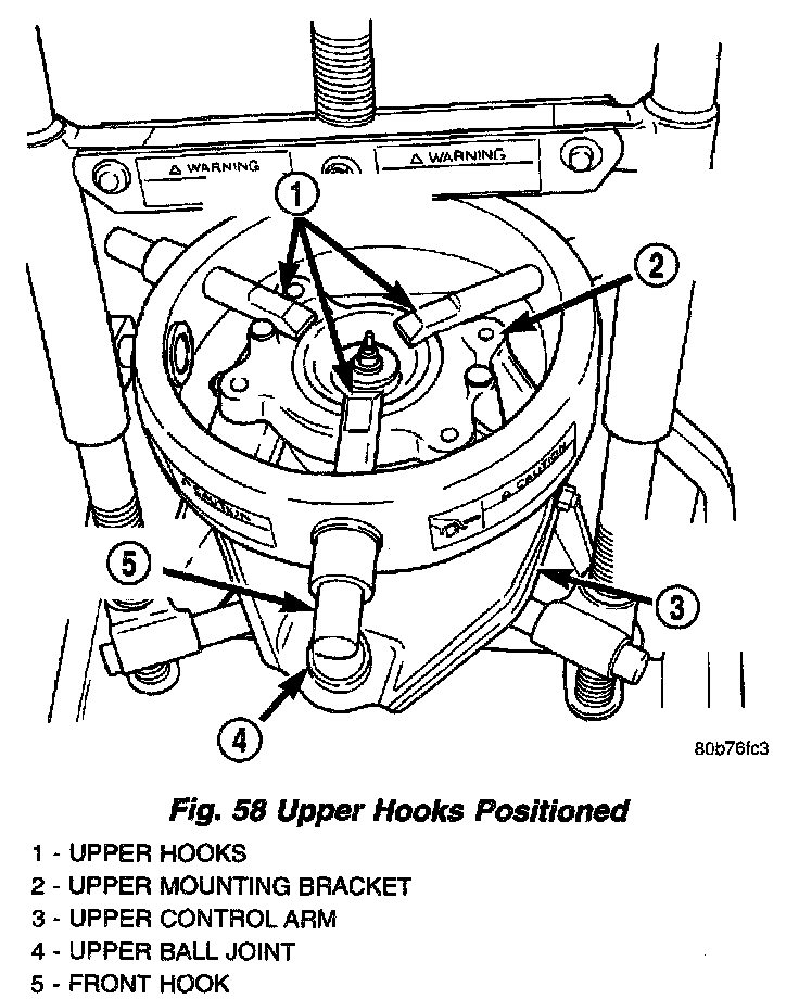 4. Install the upper (shock absorber/upper control arm) mounting bracket on top of the coil spring matching the coil spring to its isolator on the upper mounting bracket. Position the upper control arm ball joint so it lies directly below the front upper hook as shown.