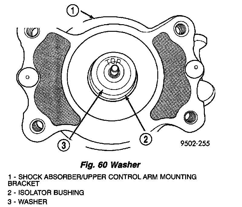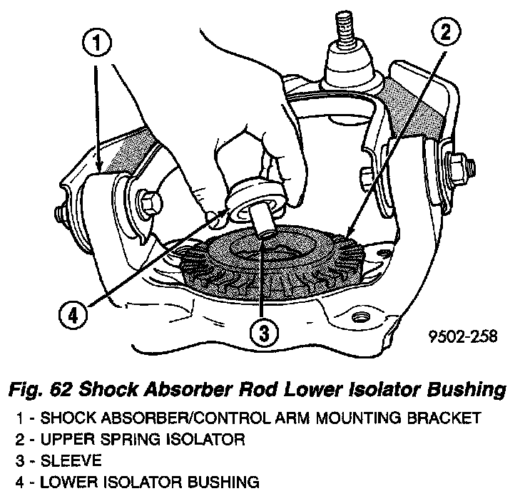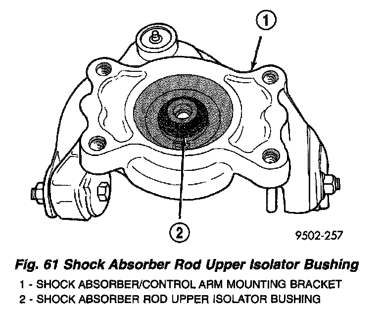 10. Remove the shock absorber rod lower isolator bushing and sleeve from the upper (shock absorber/upper control arm) mounting bracket. Remove upper coil spring isolator from mounting bracket.