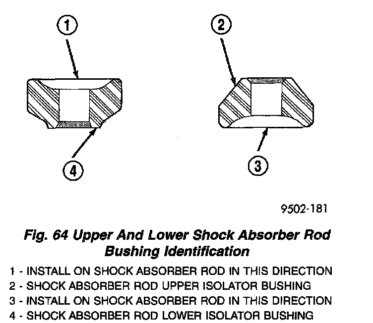 - Check the upper and lower shock rod isolator bushings for severe deterioration of the rubber.