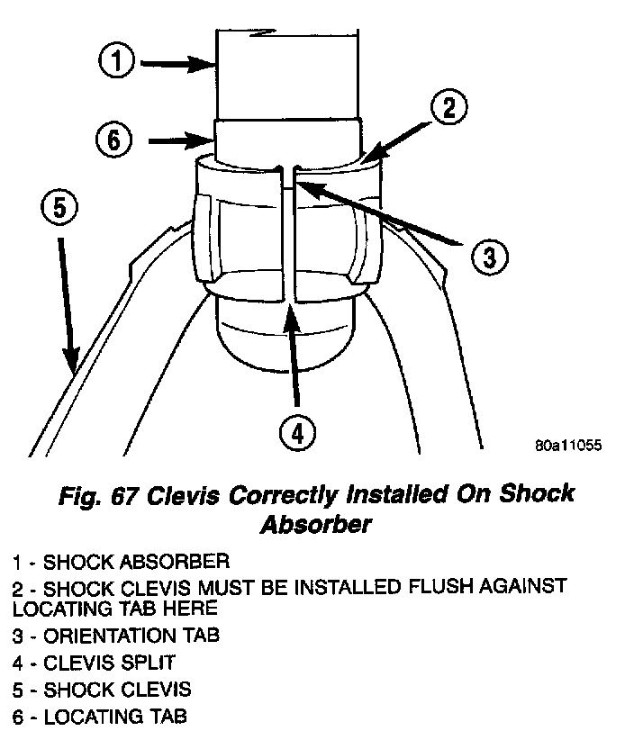 2. Install the clevis on the shock absorber. Clevis is installed by tapping it onto the fluid reservoir of the shock absorber using a soft (brass) drift until fully seated against locating tab on shock absorber. Orientation tab on locating tab must be positioned in the split of the clevis.