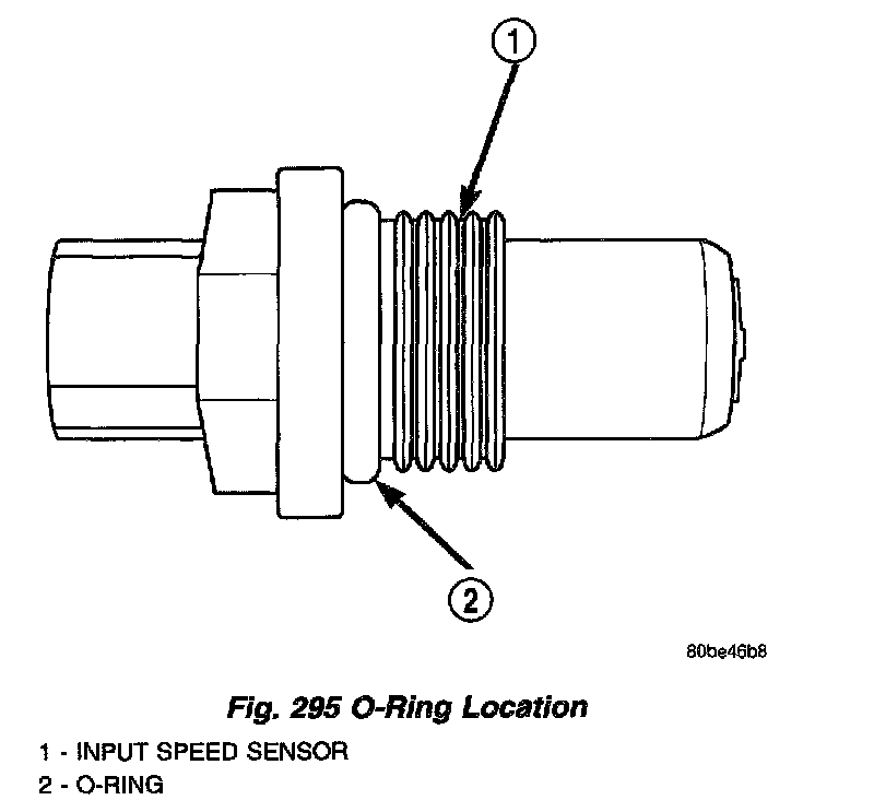 The Input Speed Sensor is a two-wire magnetic pickup device that generates AC signals as rotation occurs. It is threaded into the transaxle case (Fig. 294), sealed with an O-ring (Fig. 295), and is considered a primary input to the Transmission Control Module (TCM).