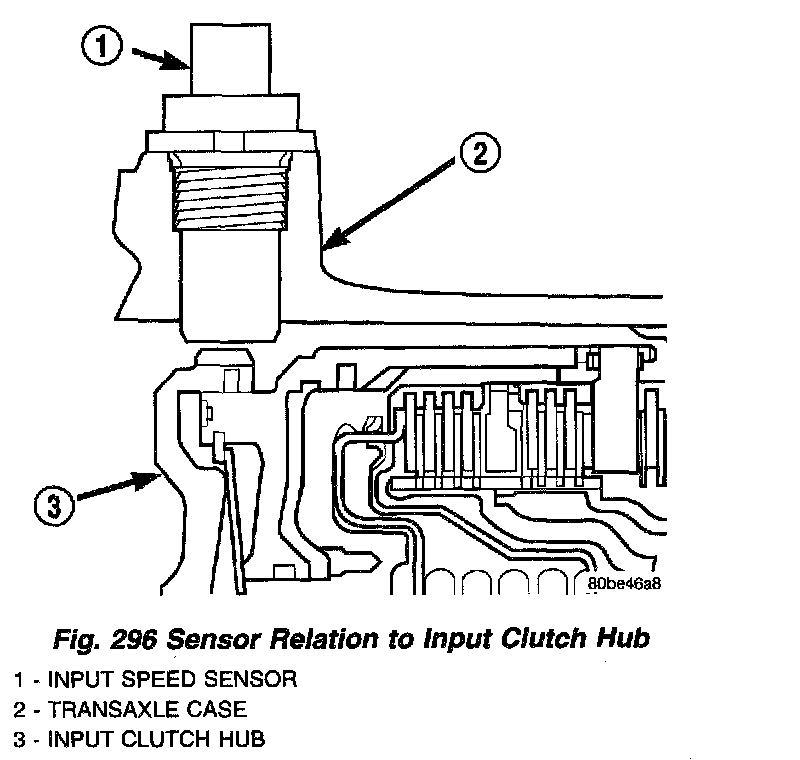 The Input Speed Sensor provides information on how fast the input shaft is rotating. As the teeth of the input clutch hub pass by the sensor coil (Fig. 296), an AC voltage is generated and sent to the TCM. The TCM interprets this information as input shaft rpm.