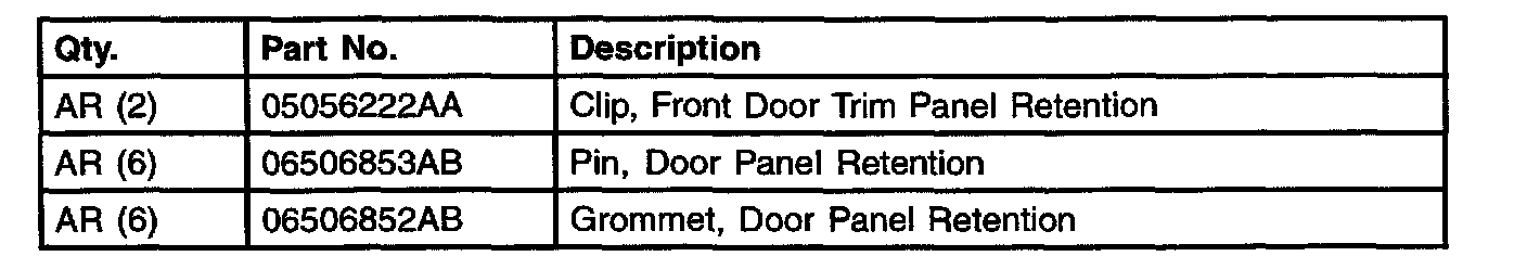 11. Replace the three rear edge door trim panel retention pins, pin 06506853AB and grommets, p/n O6506852AB.