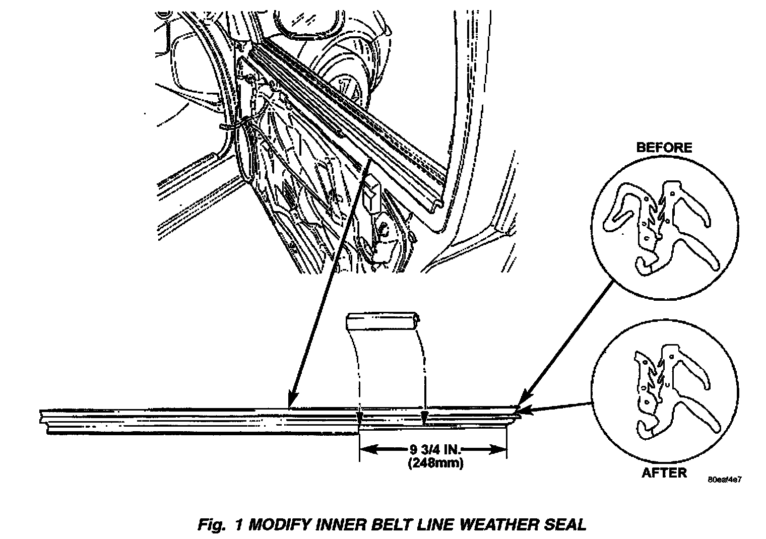 7. Measure 248 mm (9 3/4 in.) from the rear edge of the inner belt line weather seal and place a mark on the lip used for door trim panel retention. (Fig. 1)