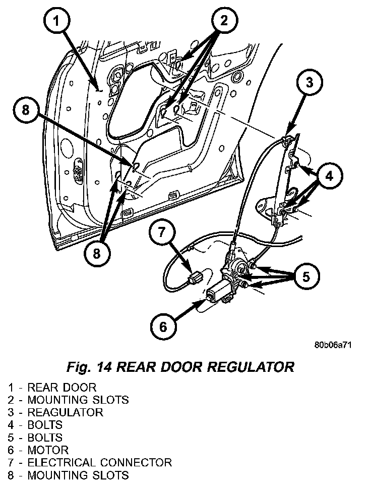 4. Loosen screw attaching regulator scissor channel to door panel (Fig. 14).