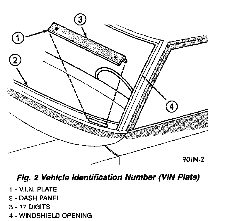 The Vehicle Identification Number (VIN) is located on the upper left corner of the instrument panel, near the left windshield pillar (Fig. 2). The VIN consists of 17 characters in a combination of letters and numbers that provide specific information about the vehicle. Refer to VIN Code Breakdown table for decoding information.