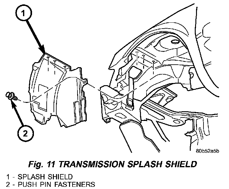 2. Remove the seven push pin fasteners, the three screws, and remove the transmission splash shield (Fig. 11).