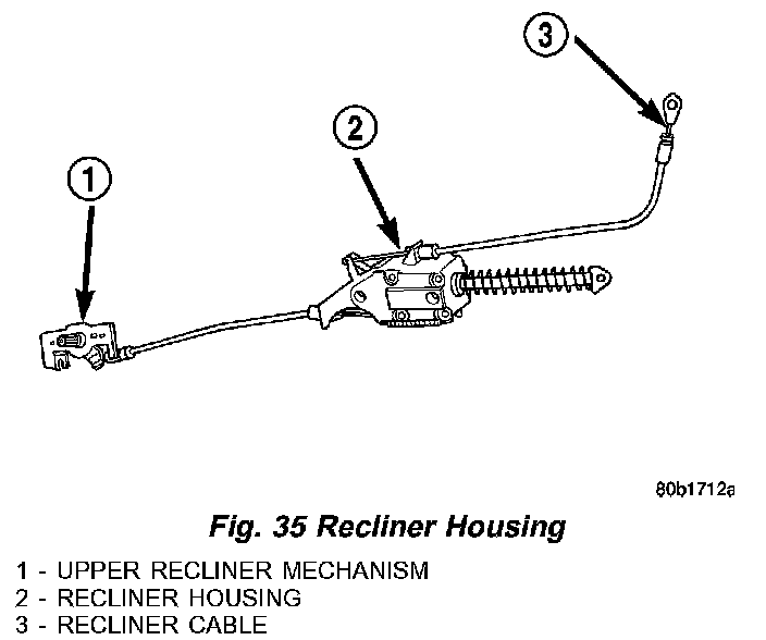 9. Pull recliner housing and upper recliner handle mechanism downward and out through bottom of seat frame (Fig. 35).