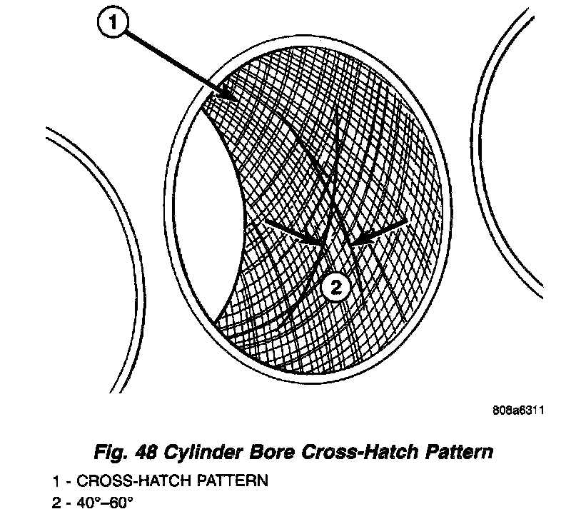 3 Honing should be done by moving the hone UP and down fast enough to get a cross-hatch pattern When hone marks intersect at 40-60 degrees, the cross hatch angle is most satisfactory for proper seating of rings (Fig. 48).
