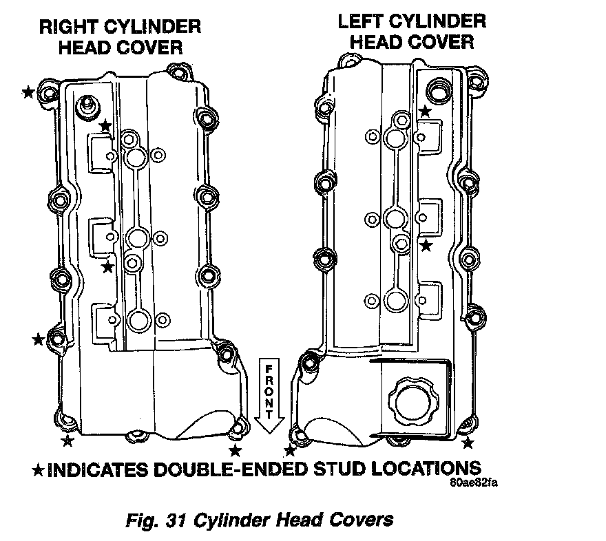 2. Install cylinder head cover and hand start all fasteners. Verify that all double-ended studs are in the correct locations as shown in (Fig. 31).