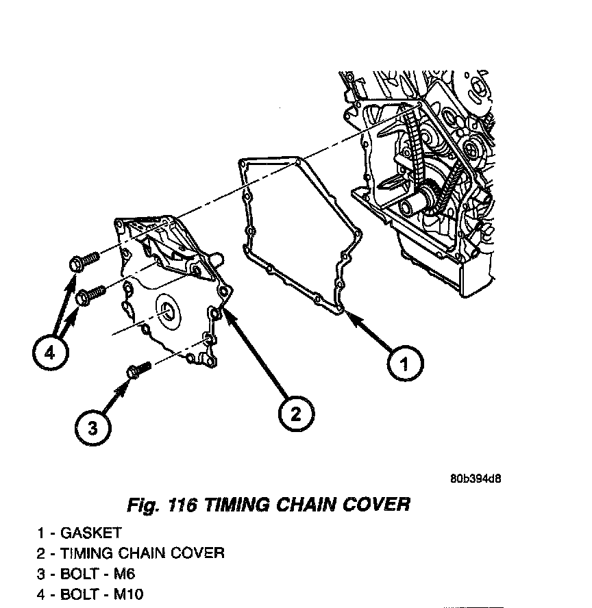 16. Remove remaining bolts securing timing chain cover to engine (Fig. 116).