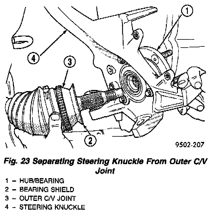 11. Separate the steering knuckle from the outer C/V joint. Seperate steering knuckle from outer C/V joint, by supporting the driveshaft while pulling steering knuckle away from the outer C/V joint.