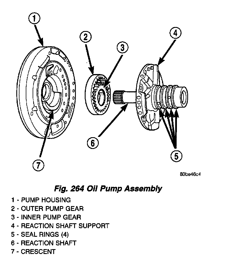 DESCRIPTIONThe oil pump is located in the pump housing inside the bell housing of the transaxle case (Fig. 264). The oil pump consists of an inner and outer gear, a housing, and a cover that also serves as the reaction shaft support.