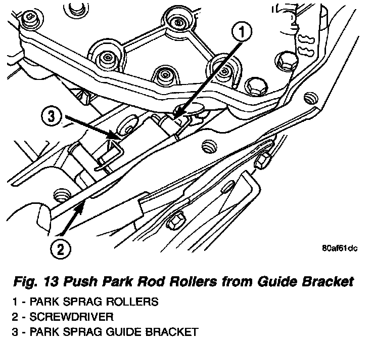 9. Using a screwdriver, push park rod rollers away from guide bracket (Fig. 13) and remove valve body assembly (Fig. 14).
