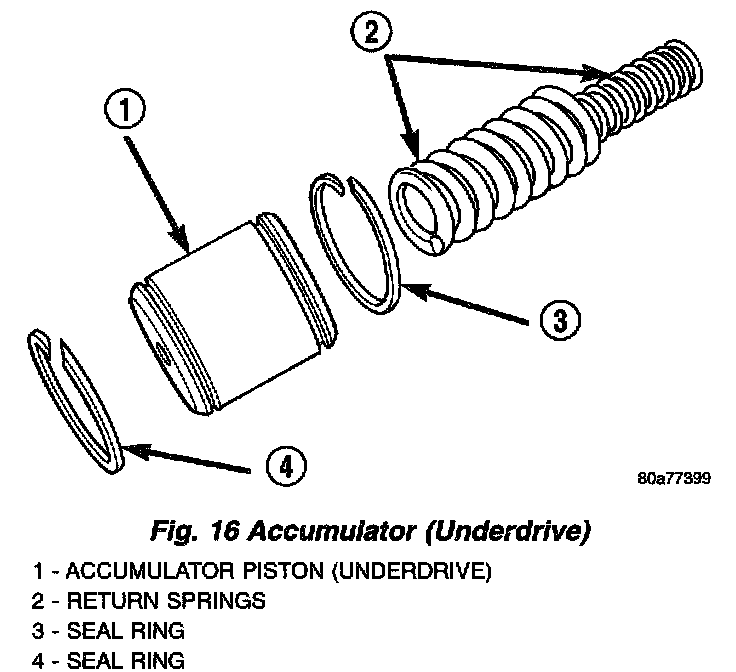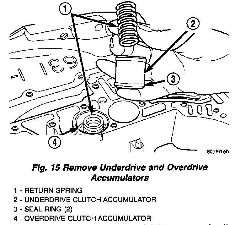 10. Remove underdrive and overdrive accumulators (Fig. 15) (Fig. 16) (Fig. 17).