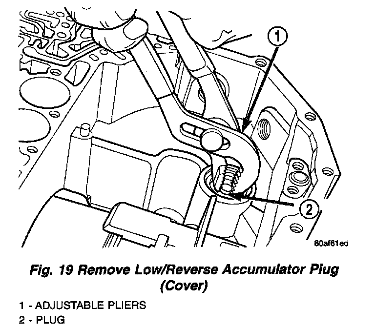 12. Remove low/reverse accumulator plug (Fig. 19).