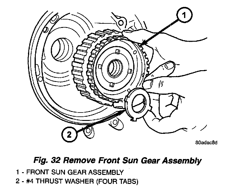 24. Remove front sun gear assembly and # 4 thrust washer (Fig. 32).