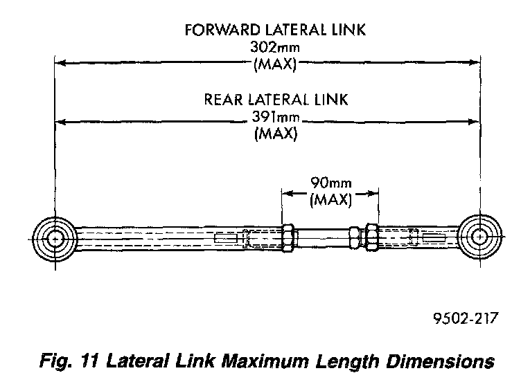 CAUTION: When setting rear camber and toe on this vehicle, the maximum lengths of the lateral links at the locations shown must not be exceeded. If these lengths are exceeded, inadequate retention of the turnbuckle to the inner and outer link may result.
