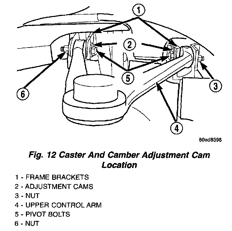 The camber and caster angles are adjusted using adjustment cams. There is one cam located on each upper control arm pivot bolt. Correct camber and caster specifications are obtained by simultaneously rotating the front and rear adjustment cams until the upper control arm is correctly positioned. Set front camber and caster at each front wheel using the following procedure.