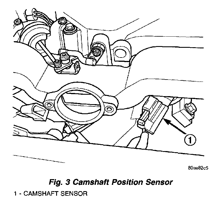 The camshaft position sensor is installed in the timing belt housing cover above the left camshaft sprocket.
