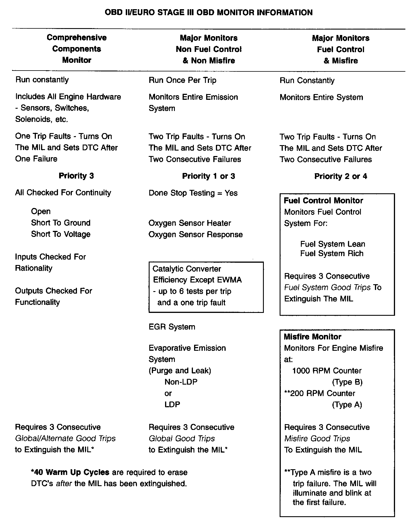 The following table summarizes the various OBDII/Euro Stage III OBD monitors operation.