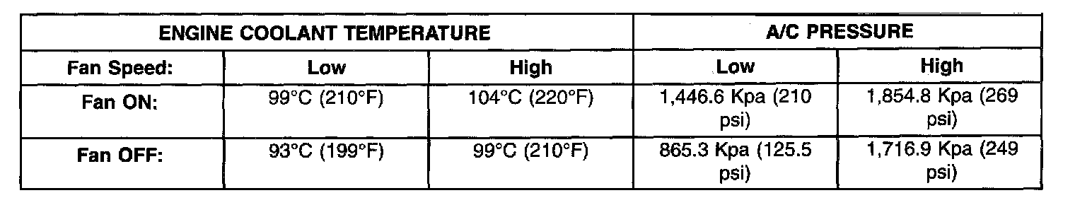 Radiator Fan Operation Temperatures Specifications