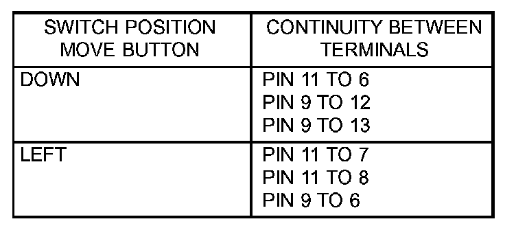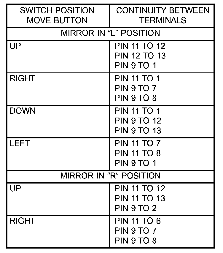 3. Using an ohmmeter, test for continuity between the terminals of the switch as shown in the Mirror Switch Test table.
