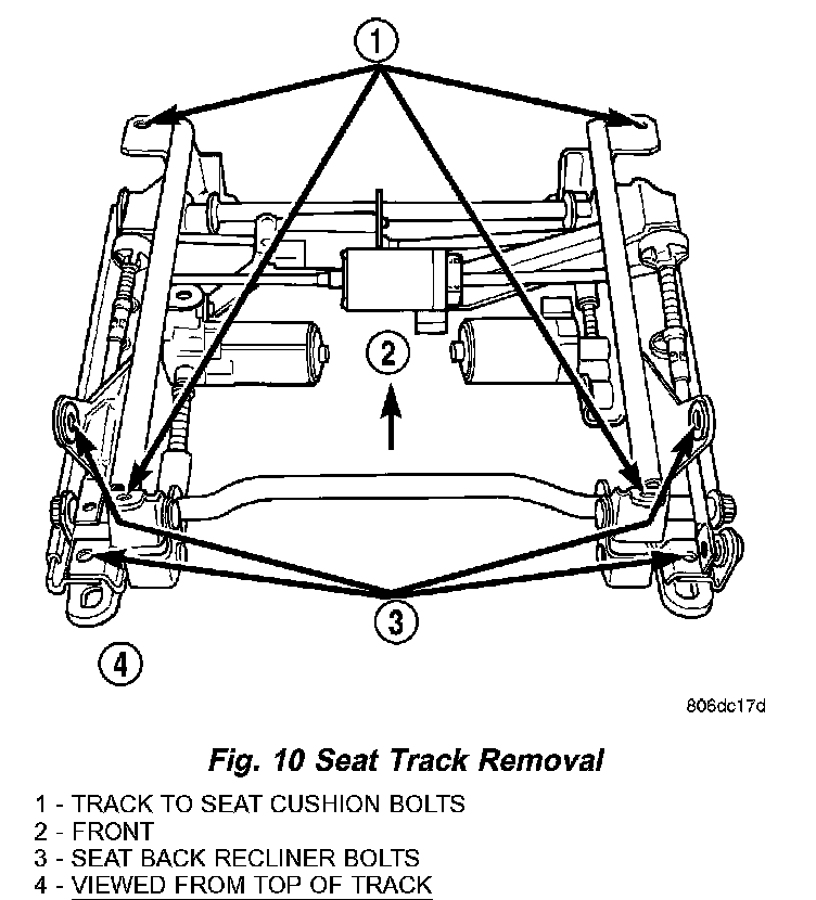REMOVALWARNING: SOME VEHICLES ARE EQUIPPED WITH SEATBACK MOUNTED AIRBAGS. BEFORE ATTEMPTING TO DIAGNOSE OR SERVICE ANY SEAT OR POWER SEAT SYSTEM COMPONENT YOU MUST FIRST DISCONNECT AND ISOLATE THE BATTERY NEGATIVE CABLE. THEN WAIT TWO MINUTES FOR THE SYSTEM CAPACITOR TO DISCHARGE BEFORE FURTHER SYSTEM SERVICE. THIS IS THE ONLY SURE WAY TO DISABLE THE AIRBAG SYSTEM. FAILURE TO DO SO COULD RESULT IN ACCIDENTAL AIRBAG DEPLOYMENT AND POSSIBLE PERSONAL INJURY.