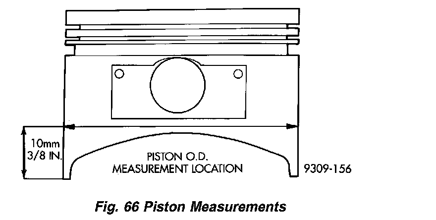 Piston diameter should be measured 90 degrees to piston pin at size location shown in (Fig. 66). Cylinder bores should be measured halfway down the cylinder bore and transverse to the engine crankshaft center line. Refer to Specifications. Specifications