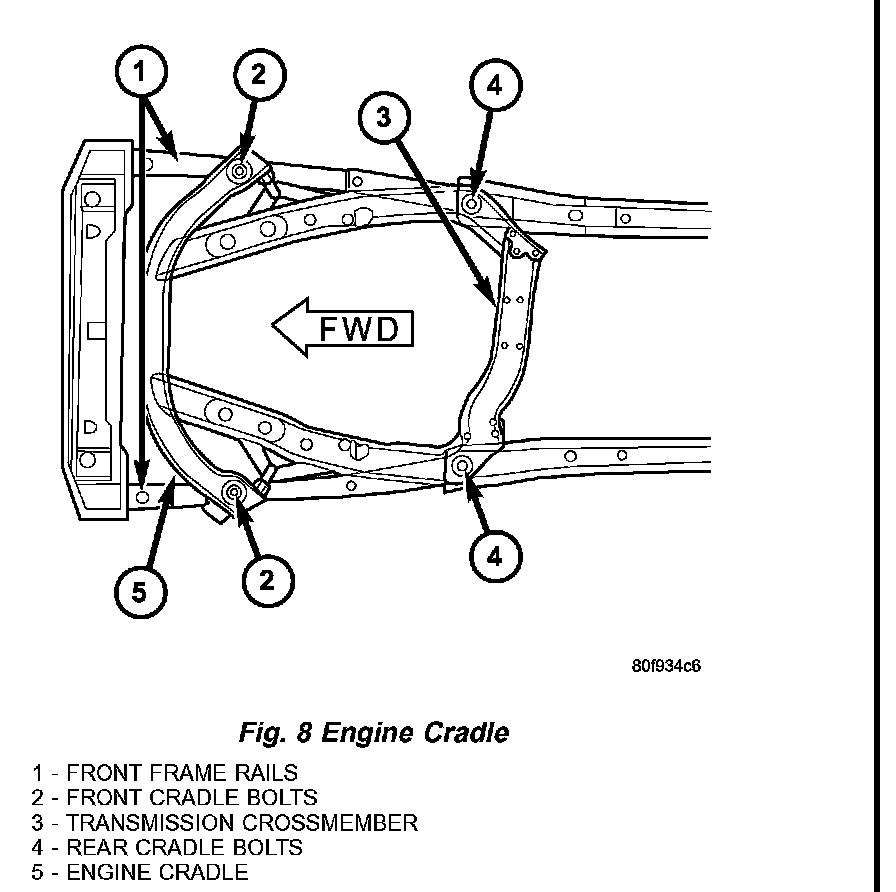 6. Raise engine cradle with transmission jack until cradle contacts vehicle body. Install rear cradle bolts. Torque rear cradle bolts to 102 Nm (75 ft. lbs.). Torque front cradle bolts to 109 Nm (80 ft. lbs.).